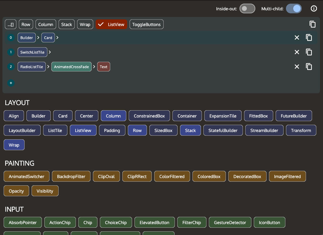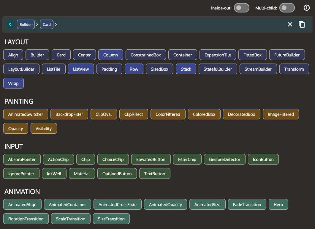 The Flutter Architect app is designed to make building deeply nested widgets a breeze. Simply click on a widget to add it to your tree. Build your widgets from the inside out or vice versa.