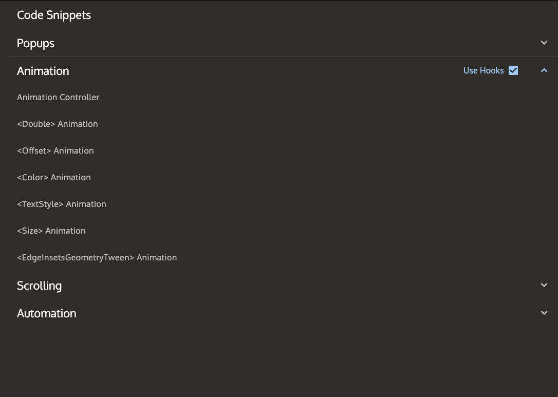 Explore the growing library of Flutter snippets for everything from popup dialogs to animation boilerplate code.